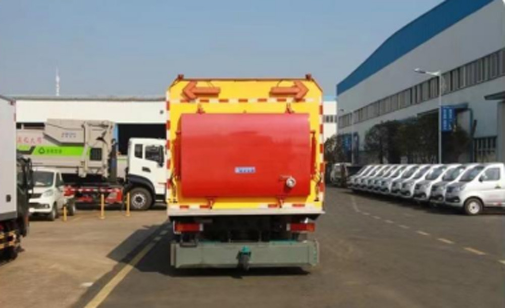 11. 垃圾箱為舉升自卸結構,垃圾箱內帶有高壓出水自潔裝置,整體傾倒角度>50°,垃圾傾倒更徹底。