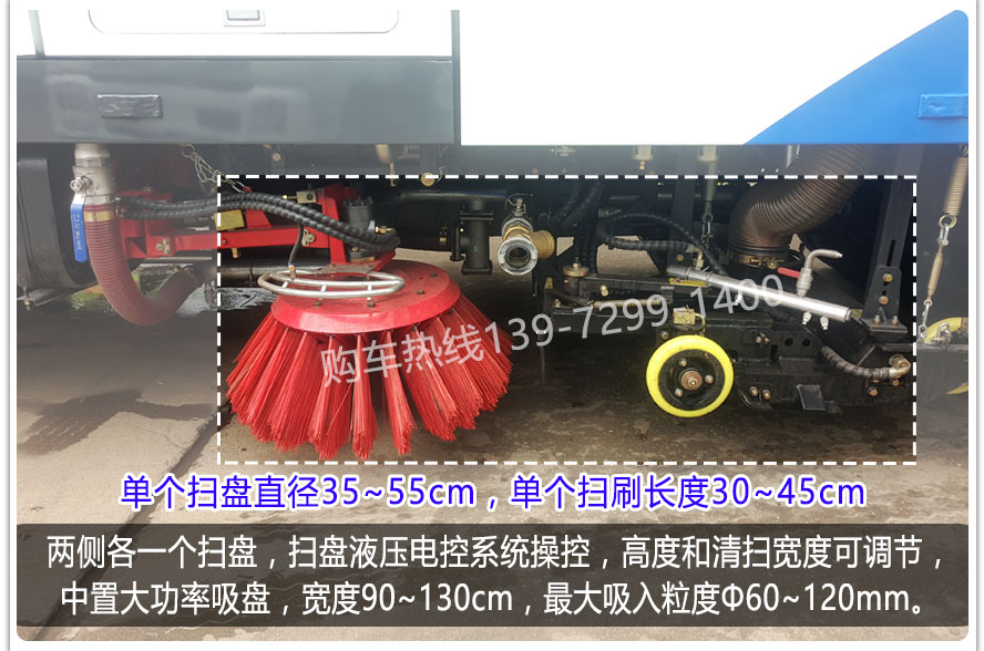 二、上裝配置: 1、帶2個中置掃盤;中置超寬吸嘴;雙層吸塵筒;康明斯170馬力副發(fā)動機,3800軸距多利卡配江鈴64kW增壓副發(fā)動機;臺灣液壓閥;大力馬達(dá);德國高壓水泵(前沖/側(cè)噴/中噴/后噴霧)/側(cè)沖洗水槍/垃圾箱自潔裝置);萬向高壓路沿清洗;威龍低壓泵(前沖),氣動球閥控制;4mm不銹鋼垃圾箱;不銹鋼水箱;德國控制器;尾部箭頭燈;機油、垃圾箱、水箱均帶防溢或低位報警裝置;倒車及洗掃狀態(tài)室內(nèi)監(jiān)視器;多種語音提示;倒車自動保護、防傾倒垃圾翻車保護、檢修安全保護;20m高壓沖洗卷盤;刷臂轉(zhuǎn)動機構(gòu)使用德國進口高新耐磨工程隔套