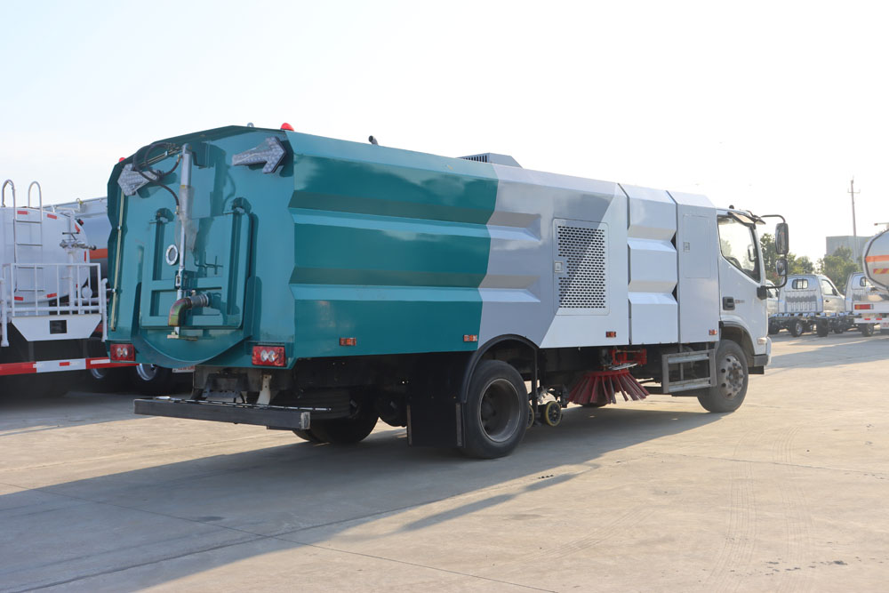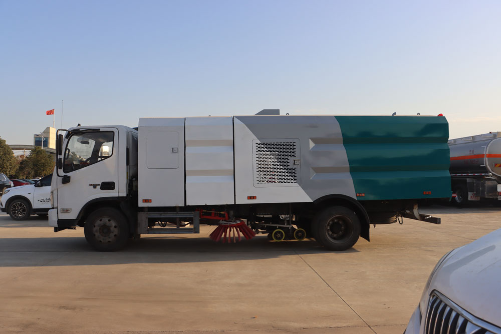 ● 左右側噴桿V形布置和吸嘴內置主噴桿無間隙高壓噴嘴噴水布置,有效的將清洗后的污水和垃圾全部歸攏趕至吸嘴處,并吸收于污水垃圾箱內,使路面不留塵土、積水,路面清洗、刷掃和污水回收效果佳。