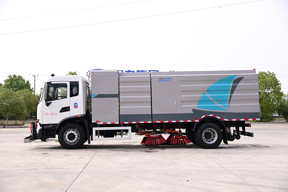 3、掃路車采用東風純電動二類汽車底盤改裝,加裝風機、清水箱、垃圾箱、左右立掃、掃盤降塵系統、液壓