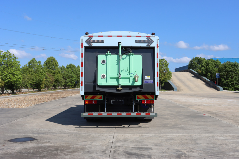 ● 清水箱和垃圾箱分體布置,有效空間利用最大化,一次連續(xù)作業(yè)時(shí)間長(zhǎng)。同時(shí)在作業(yè)過(guò)程中可通過(guò)污水排放裝置對(duì)污水進(jìn)行排放,隨時(shí)加清水繼續(xù)作業(yè);垃圾箱采用雙油缸自卸卸料,箱內(nèi)同時(shí)設(shè)有大流量高壓噴嘴,可快速?zèng)_洗垃圾箱