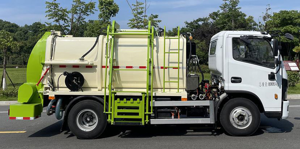 整車為全封閉型,采用電氣液一體化技術(shù),借助機、電、液聯(lián)合自動控制系統(tǒng),通過垃圾箱、上料機構(gòu)和推鏟等專用裝置,實現(xiàn)垃圾收集和卸料。