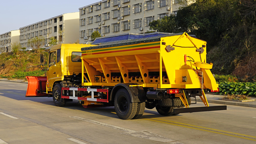 四、其他說明: 東風天錦多功能除雪車,集掃雪、推雪、吹雪、撒布等多種功能于一體,可通過更換不同的作業裝置,如除雪鏟、掃雪滾刷等,滿足不同場景下的除雪需求,有效提升掃雪鏟冰的工作效率和作業質量.