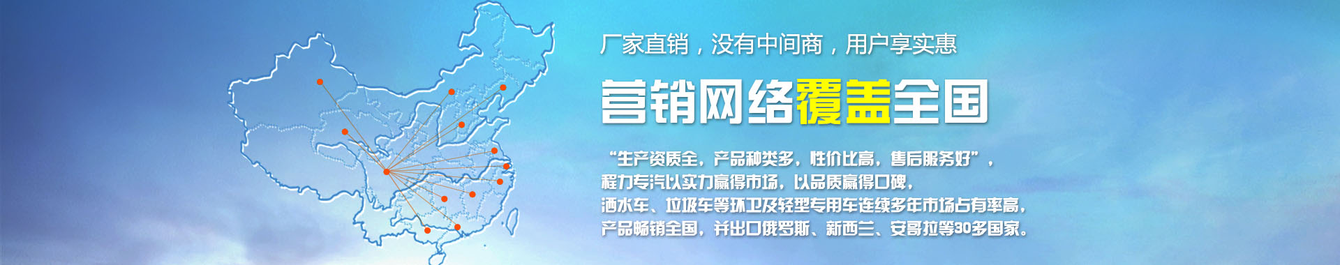 我公司致力于開發(fā)生產(chǎn)銷售專用汽車為已任,為您量身打造方便實(shí)用,耐用的專用汽車,其主導(dǎo)品種有園林綠化灑水車、環(huán)衛(wèi)灑水車、油罐加運(yùn)油車、吸糞車、吸污車、擺臂、掛桶、密封式垃圾車、廂式運(yùn)輸車、消防車、半掛車、自卸車、水泥車、隨車吊等八大系列100多個品種300多個車型。同時批發(fā)東風(fēng)、解放、福田等各種二類底盤。目前我公司銷售網(wǎng)絡(luò)基本已覆蓋全國各地,具體如下。