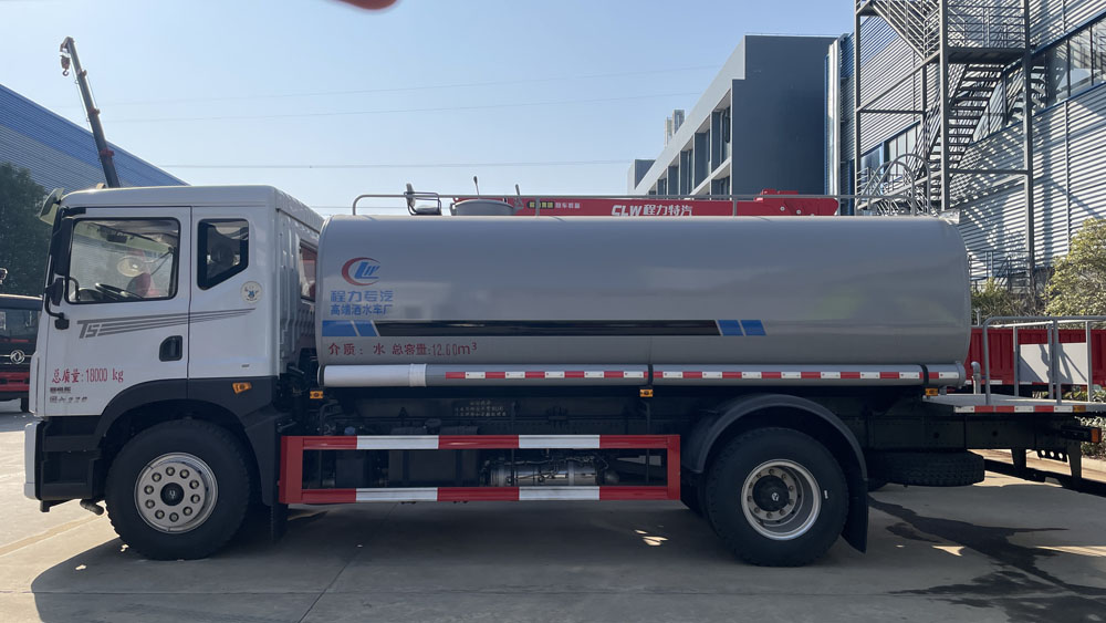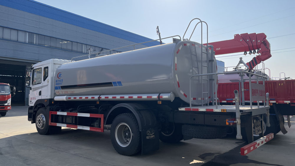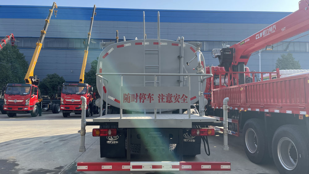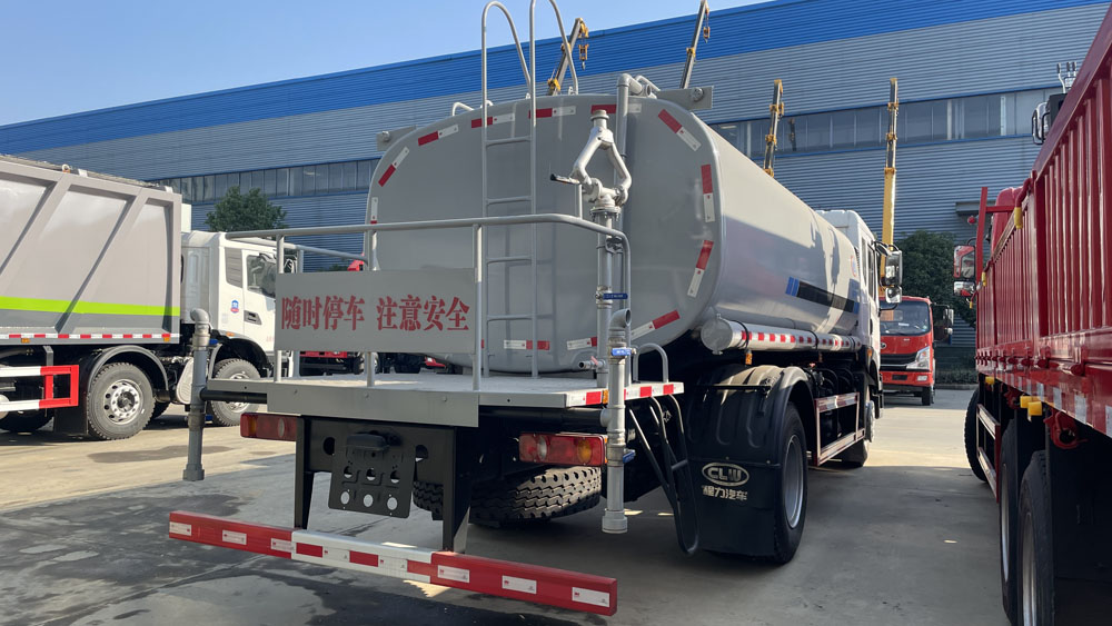 三、選裝配置: 選配駕駛室內電控氣動操作;大鴨嘴前沖噴頭壹對;萬向前沖球閥;路面沖洗水管卷盤;本田高壓水泵,水槍可沖洗人行道、移動洗車等; 藥盤;長警燈,LED箭頭燈;罐側帶閘門,罐后加裝噴霧降塵裝置;灑水車泵標配程力泵選配杭州威龍泵;可對主管道加粗,可選316大口徑球閥;罐體內防腐、保溫、襯塑處理,灑水車作運水車用可加裝自流口。運熱水罐體可做保溫,運生活用水可做食品級304不銹鋼罐體。