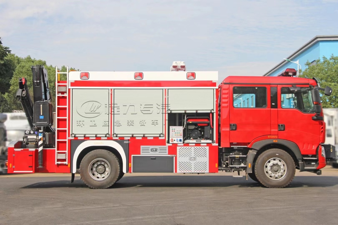 重汽豪沃搶險救援消防車,前拖后吊,具有起吊、自救/牽引、清障、發電、照明等功能,可裝備大量的破拆、偵檢、堵漏、防護等各類消防器材或工具;